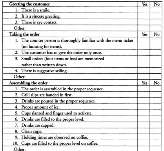 It is often the circumstances around a company that dictate the applicability of one metaphoric lens over another. For example, when the environment around an organization is static, the machine-like elements of a company pop to the foreground. When interactions with the outside world are predictable, corporations can create formulaic routines for optimizing their internal behavior. For example, from Morgan’s book, the below performance checklist applied to workers at a fast food restaurant demonstrates how even human interactions can be assessed in a binary machine-like manner.