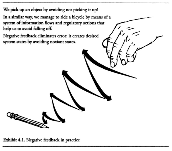 … when we pick up an object from a table we typically assume that our hands, guided by our eyes, move directly toward the object. Cybernetics suggests not. This action occurs through a process a process of error elimination, whereby deviations between hand and object are reduced at every stage of the process, so that in the end no error remains. We pick up the object by avoiding not picking it up.