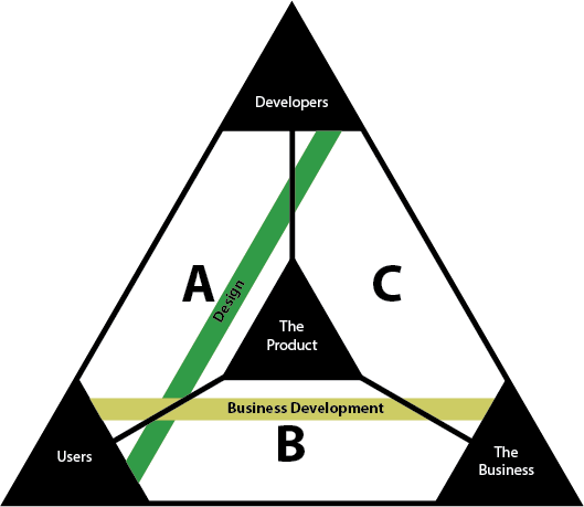 We’ve discussed white space in the product network signified by regions A, B, and C in the Product Management Triangle. As a company matures, these regions become filled with bands connecting the elements together. A designer may be hired to form a band connecting users and developers or a head of business development may be hired to connect users and the business.